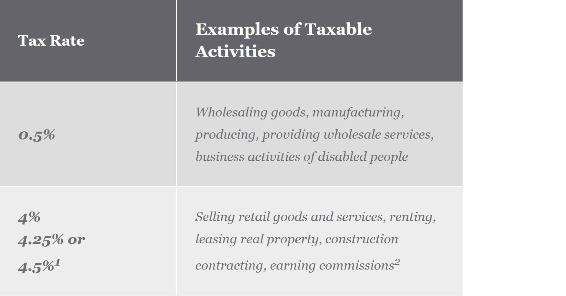 1 The 4% rate applies statewide except in a county where the tax rate includes a 0.25% or 0.5% county surcharge for a total tax rate of 4.25% or 4.5%. The county surcharge does not apply to activities taxed at the 0.5% rate (for example, selling wholesale goods) or activities sourced outside a county with a surcharge. (Note: This is not a complete list of tax rates and activities.)